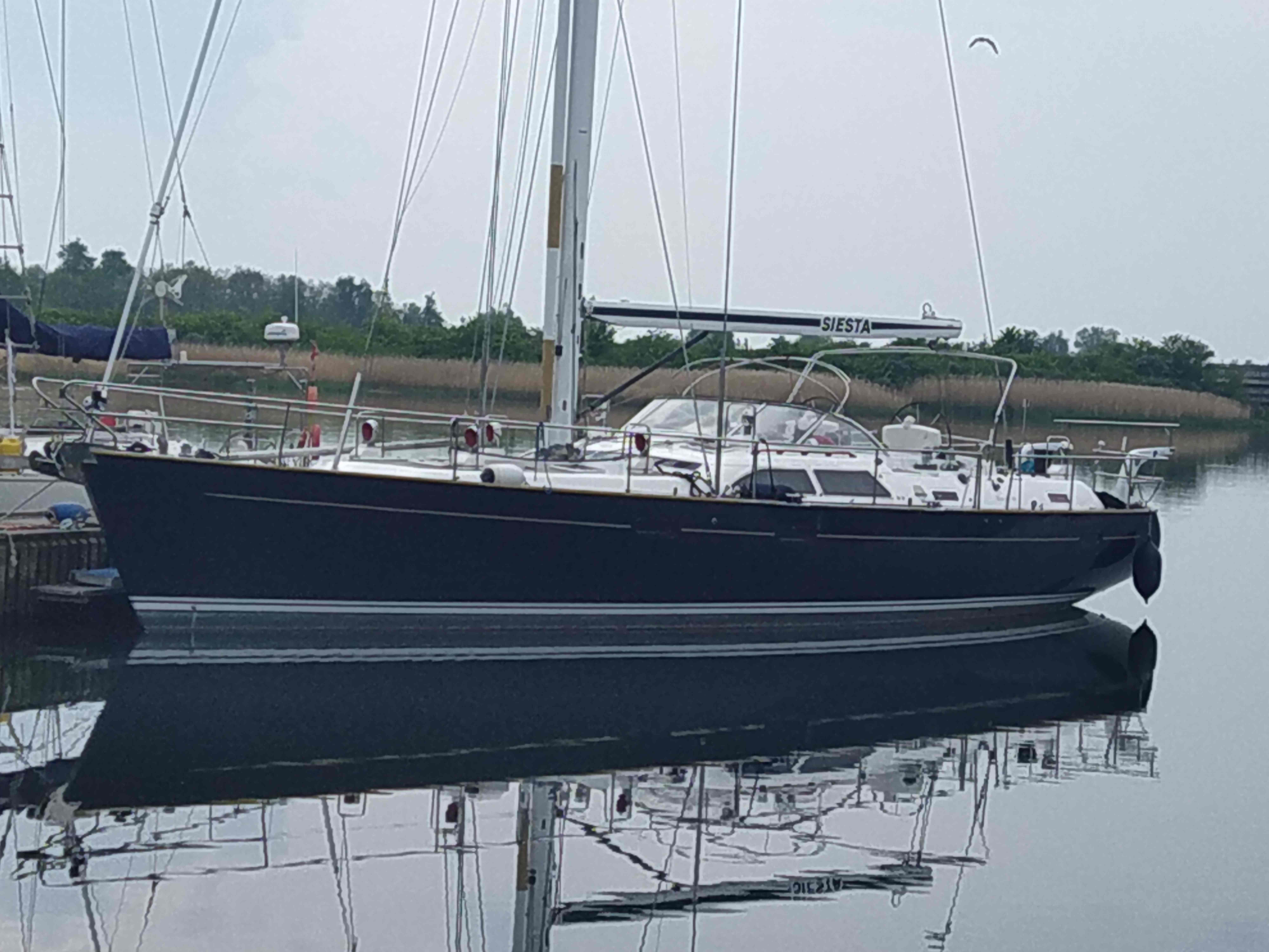 Moody 64, Siesta er en dejlig havkrydser-yacht. Designet af Bill Dixon, hun sejler godt, og med elektrisk betjente spil og motoriseret forstag af alle tre sejl, sejles hun nemt med en lille besætning. El-ankerspil for nem betjening. Hun byder på exceptionelle indkvarteringsmuligheder med ikke blot en fremragende agter kahyt for ejeren, men også en rummelig dobbelt VIP- kahyt, desuden en god dobbelt kahyt, for – og et mandskabsrum forrest, som kan bruges af mandskabet eller til andet efter ønske. Teakdæk fremstår som nyt. Agter kahyt har eget toilet/brus, VIP-kahyt også med eget toilet/brus, samt toilet / brus midtskibs.
